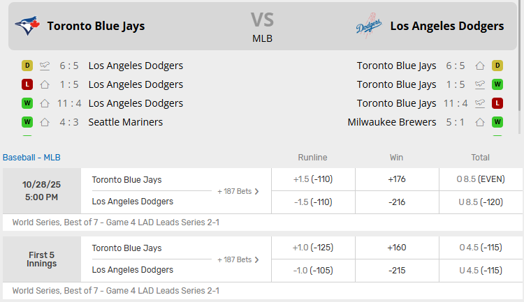 After a 6 hour and 39 minute classic, the Blue Jays and Dodgers go back at it tonight in a pivotal Game 4. The Dodgers have all the momentum and they will also have Superman on the mound. Shohei Ohtani and Shane Bieber will be asked to go deep after the bullpens were taxed on Monday night. Advantage goes to Ohtani, who also reached base a record nine times last night. Bieber struggled in his last outing against Seattle and I like the Dodgers to have success against him. Also, Toronto could be without a key bat in Springer, who left in the seventh inning last night with an injury to his right side.