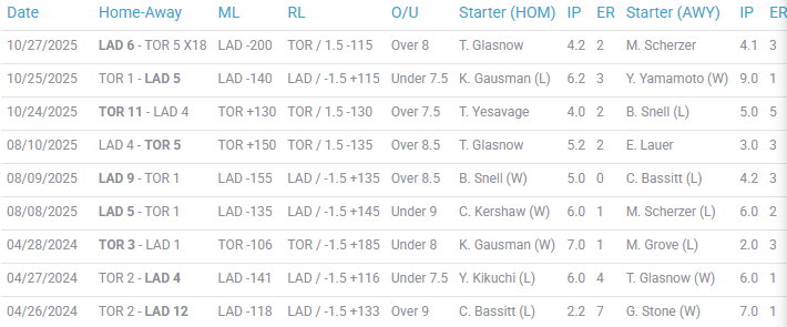 | Date | Opp | Score | M/L | O/U | S/R | RES | IP | H | R | ER | SO | BB | HR | PIT |