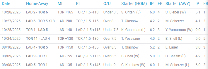 | Date | Opp | Score | M/L | O/U | S/R | RES | IP | H | R | ER | SO | BB | HR | PIT |