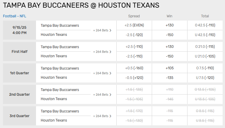 | 9/4/09 | HOU (27) - TB (20) | -3/33.5 | HOU/O | 387 | 124 | 263 | 343 | 103 | 240 |