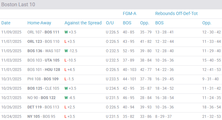 | Mar 06, '25 | BOS | 123 - 105 | BOS -13.5 | o217.5 |