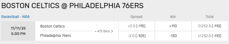 | Nov 15, '23 | PHI | 117 - 107 | BOS -1.5 | o223.5 |