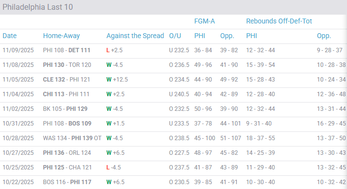 | Oct 31, '25 | PHI | 109 - 108 | PHI 2.0 | u233.5 |