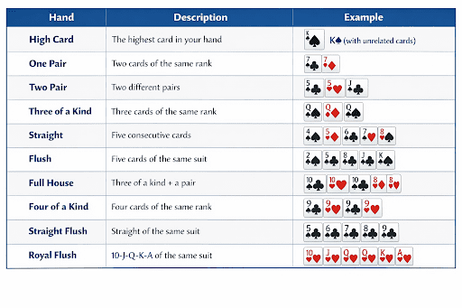 Understanding these rankings is essential because the winner of each hand is always determined by the highest-ranking five-card combination. If two or more players have the same hand type, the pot is awarded to the one with the strongest kickers (side cards). Remember that suits have equal value in poker — there is no trump suit like in some other card games. Mastering this table will help you quickly evaluate your hand strength during real play.