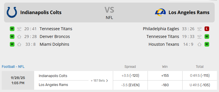 | 9/19/21 | LAR (27) - IND (24) | 4/47.5 | IND/O | 354 | 109 | 245 | 371 | 101 | 270 |
