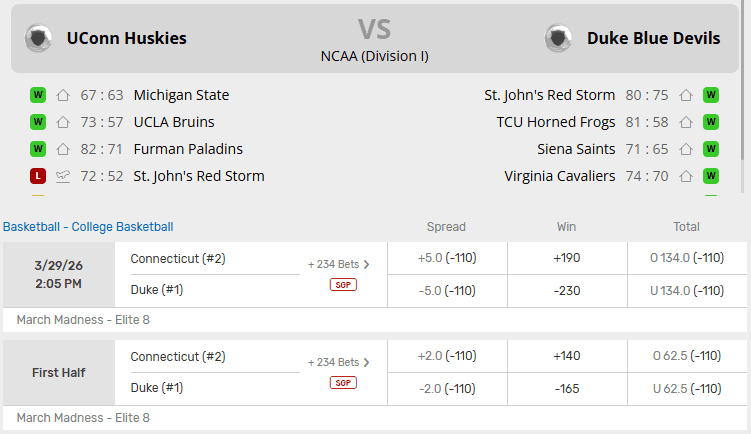 The way these two teams have been playing throughout the tournament, I can’t see this as a blowout on either side. Duke clawed their way to a win over St. John’s on Friday, while UConn did the same against Michigan State. Both teams have been playing terrific defense, which favors a lower scoring affair. Taking the points here seems like the smart move.