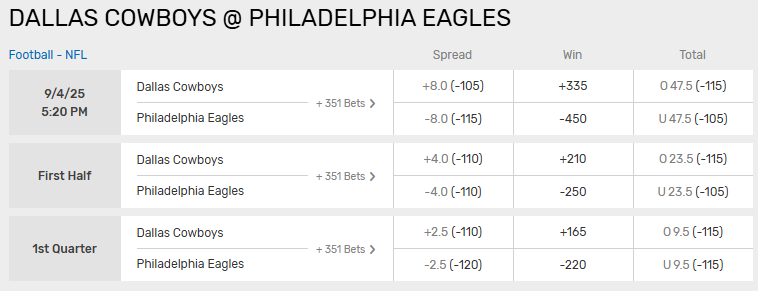 | 12/24/22 | PHI (34) - DAL (40) | -4/47.5 | DAL/O | 419 | 115 | 304 | 442 | 87 | 355 |