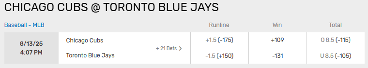 | 8/12/25 | TOR 5 - CHC 1 | J. Berrios | J. Assad | -125/9 | U |