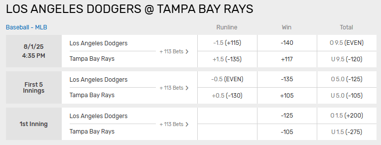 LA Dodgers (63-46) at Tampa Bay (54-56)