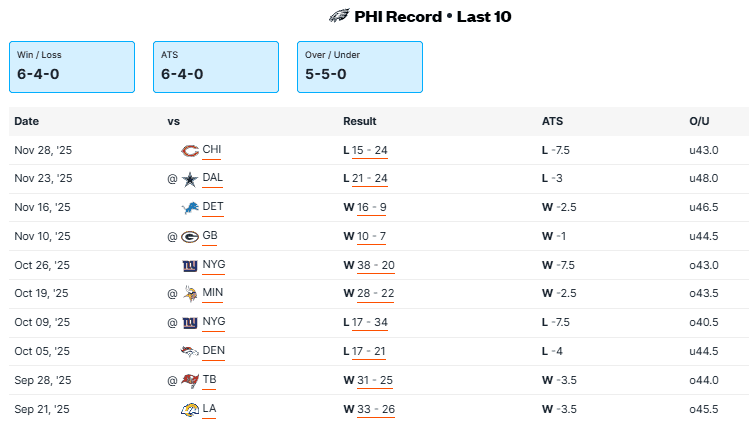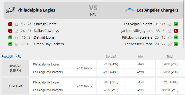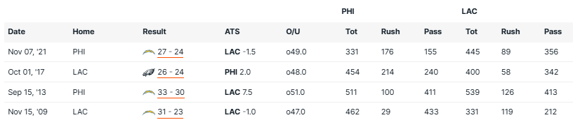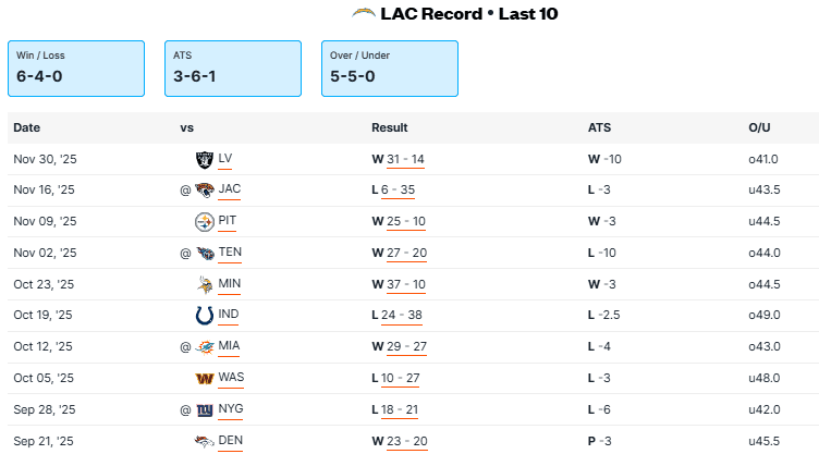 With the Eagles offense still struggling, I can’t see how they are going to score enough to win this game. Philly has scored 21 points or fewer in four straight games and were thoroughly manhandled at home to the Bears on Black Friday. The Eagles are still without All-Pro tackle Lane Johnson and won’t have defensive tackle Jalen Carter for Monday as well. The Chargers are getting back running back Omarion Hampton this week and L.A. just saw Chicago run for 281 yards against the Eagles. The Chargers defense has been playing well of late, allowing 20 points or less four of the last five games. Until Philly gets the offense moving, I can’t back them. Give me L.A. and the points.