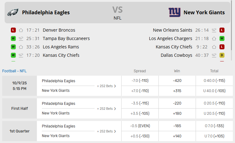 The Eagles may be 4-1 but they are not even close to playing at the level of last year’s super bowl team. The offense, especially the passing game, is kind of a mess right now. They rank 31st in passing and Saquon Barkley only has 267 yards rushing on the season. Jalen Hurts is also struggling to get in sync with his receivers. Defensively, they couldn’t hold a big fourth quarter lead last week in losing to Denver. The Giants offense has found a bit of a spark under Jaxson Dart and it’s improved the running game. Cam Skattebo has averaged 105 scrimmage yards over his last three games and ranks fourth amongst rookies in yards from scrimmage on the season, despite starting just two games.