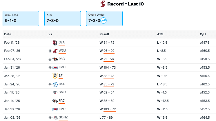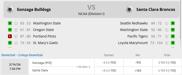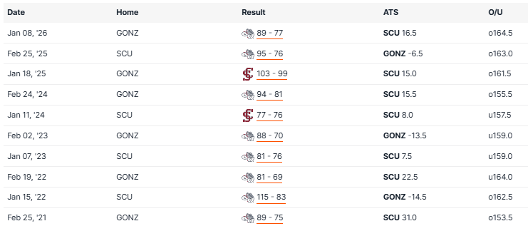 GONZAGA VS SANTA CLARA RECENT MEETINGS