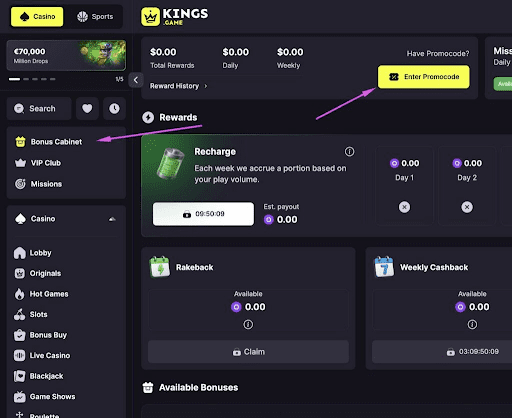 4. Go to your account now, and look for the bonus vault/promo code section, as shown in the image below.