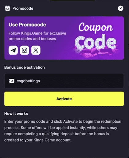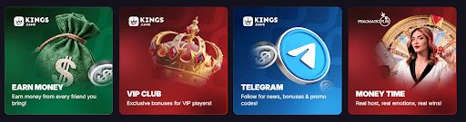 Using a Kings.Game Casino No Deposit Bonus Code, like “csgobettings” or “nodepositz” offers plenty of benefits. For instance, activating them and claiming the 77 free spins is an excellent way to start playing slots, especially for beginners, and exploring the site’s offers.