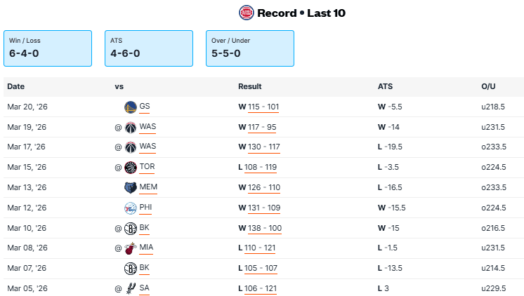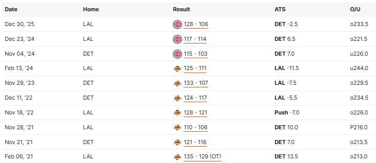 Lakers vs Pistons Recent Meetings