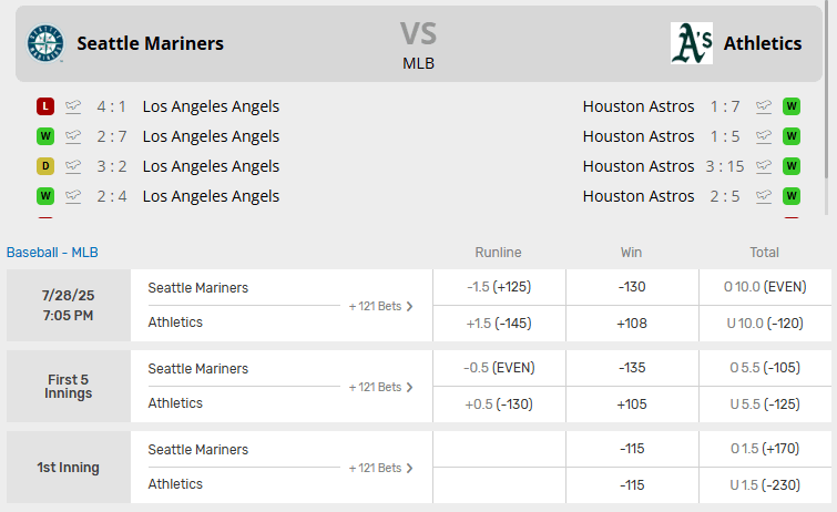 | 3/29/25 | SEA 2 - ATH 4 | B. Miller | O. Bido | -163/7 | U |