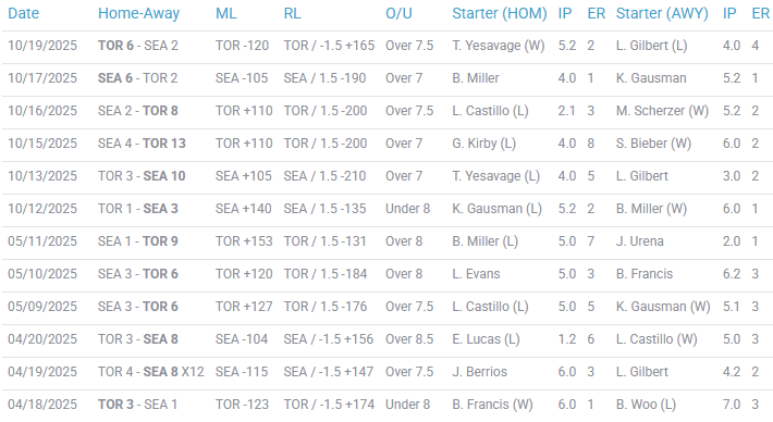 | Date | Opp | Score | M/L | O/U | S/R | RES | IP | H | R | ER | SO | BB | HR | PIT |