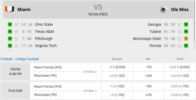 Miami FL (12-2) vs Ole Miss (13-1)