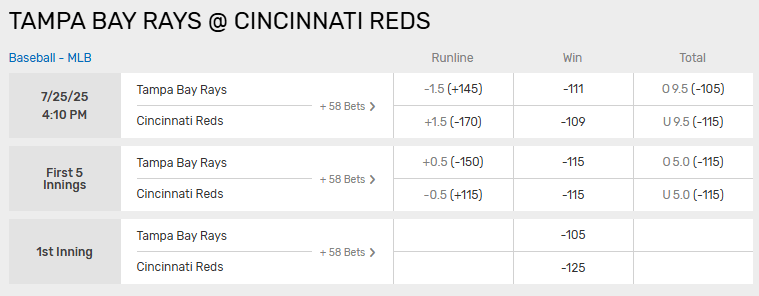 | 7/26/24 | TB 2 - CIN 3 x | S. Baz | N. Lodolo | -106/7.5 | U |