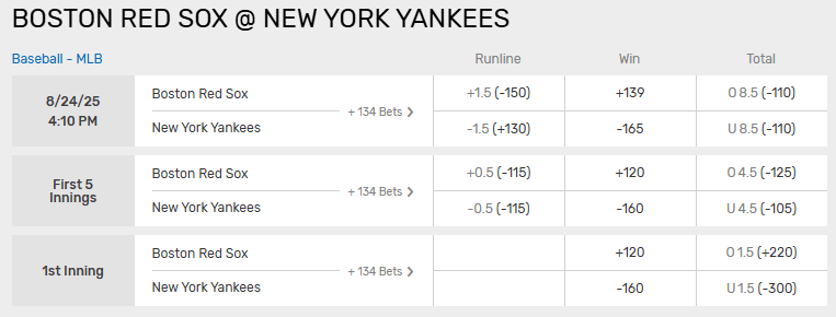 | 8/22/25 | NYY 0 - BOS 1 | M. Fried | B. Bello | -190/8.5 | U |