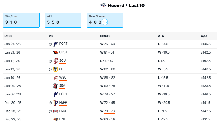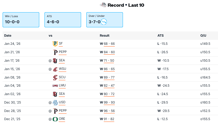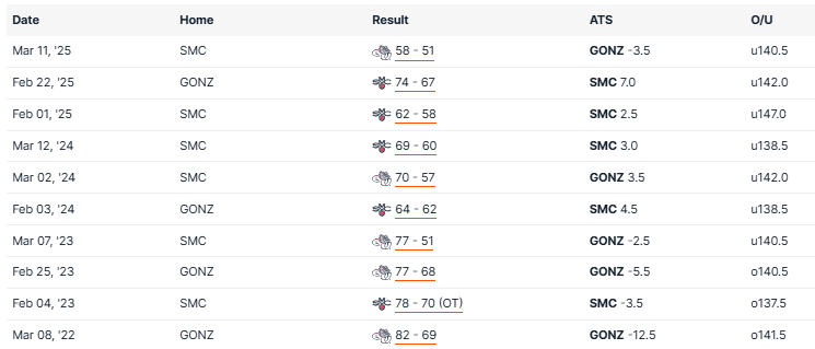 SAINT MARY’S VS GONZAGA RECENT MEETINGS