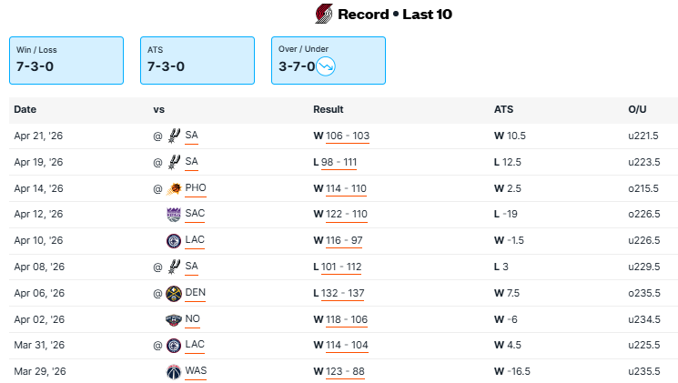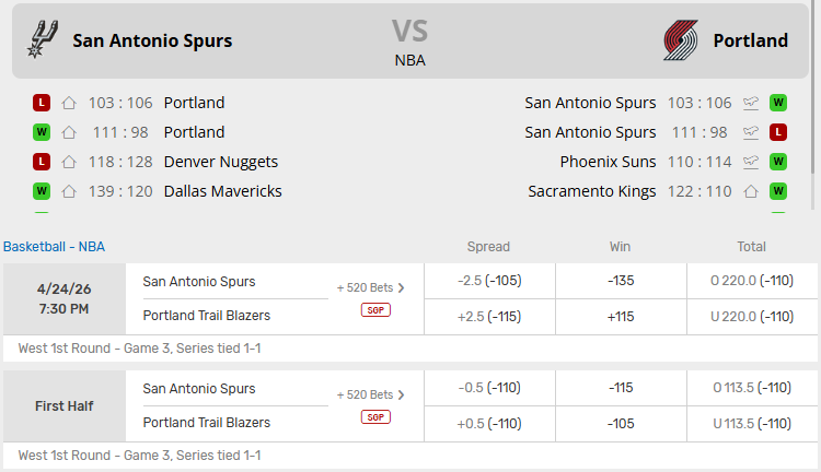 It doesn’t appear that Victor Wembanyama will be playing in this Game 3 on Friday night and that is not good news for the Spurs. The Defensive Player of the Year went down in the second quarter of Game 2 and the Blazers rallied in the fourth quarter to even the series up. Portland has been playing with confidence and momentum recently and they have won seven of eight at Moda Center. Harrison Barnes hurt his wrist on Wednesday, but should be able to go for San Antonio. Without Wemby in the middle, Portland should be able to have success in the paint and take Game 3.