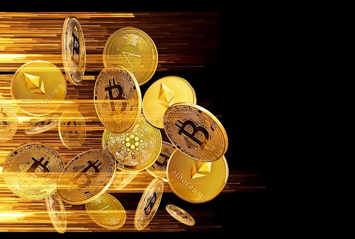 A collection of various cryptocurrency coins including Bitcoin and Ethereum against a digitally stylized golden background