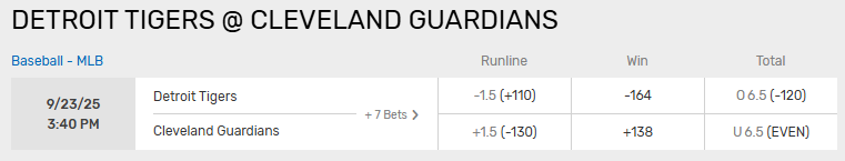 | 9/16/25 | DET 5 - CLE 7 x | C. Mize | J. Cantillo | -145/8 | O |
